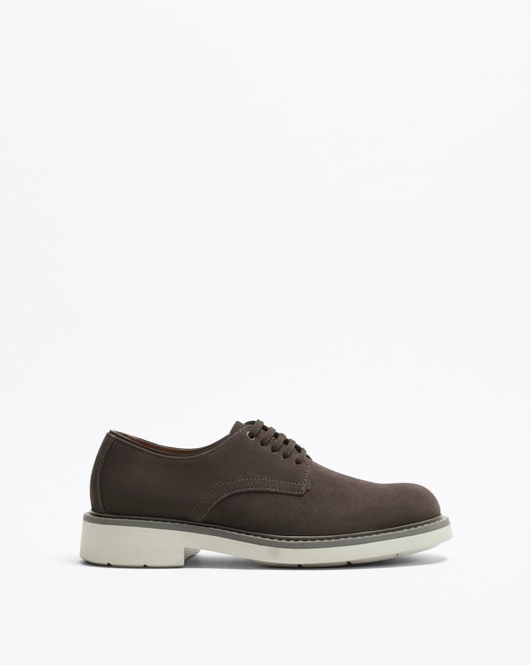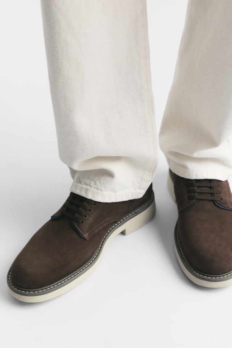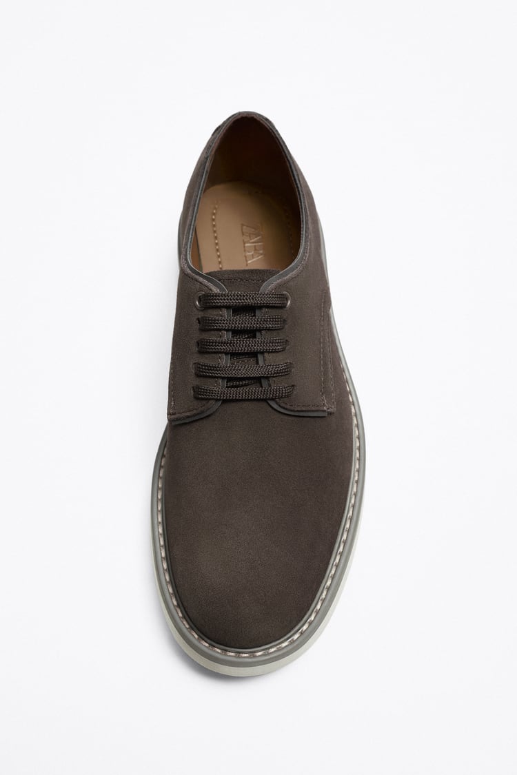 Brown coloured derby shoes with suede leather. Rounded toe. Contrast sole. Featuring fine eyelet. Contrast top-stitching.