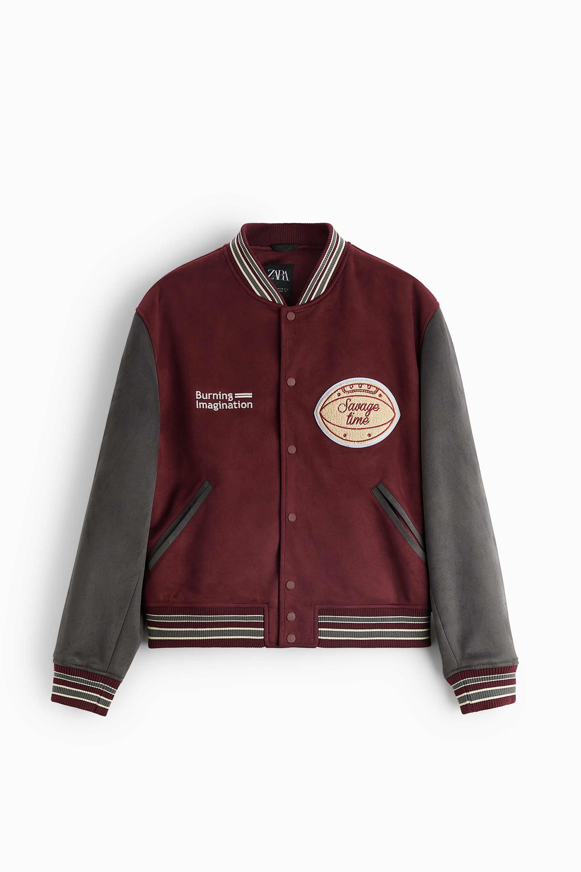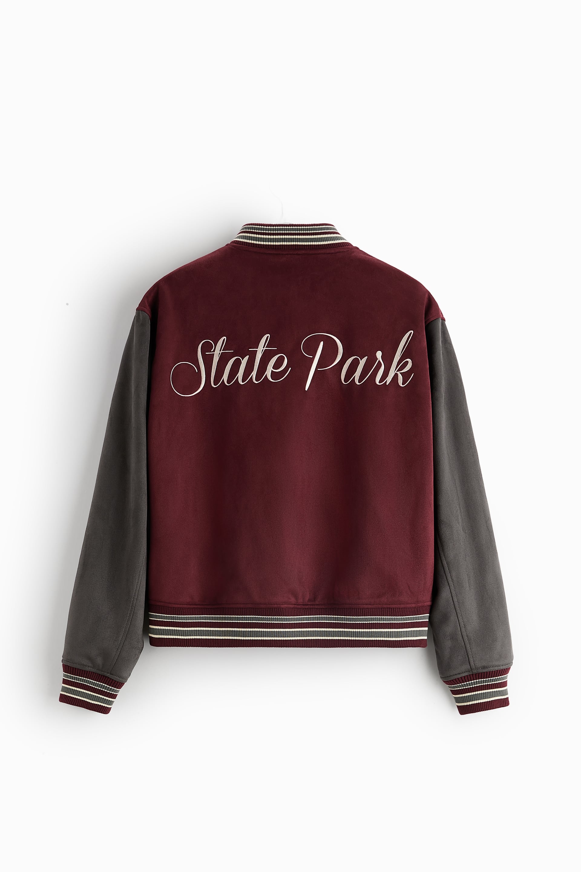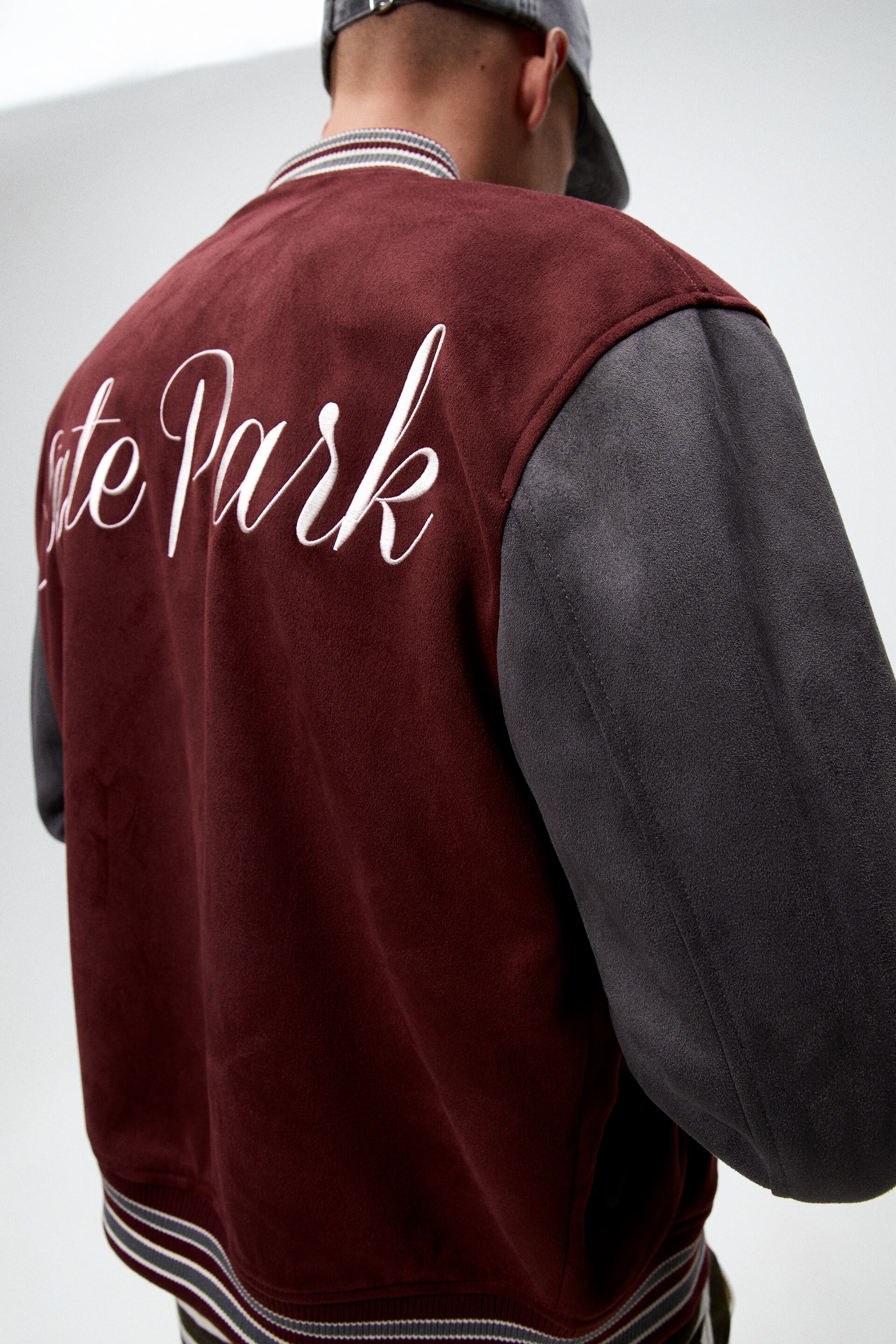 Varsity jacket featuring back and from embroidery. Front zip-up fastening. Ribbed cuffs and trims.