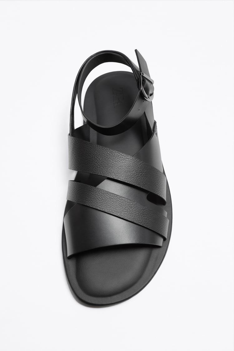 Black coloured slider sandals featuring buckle fastening. Interwoven straps.