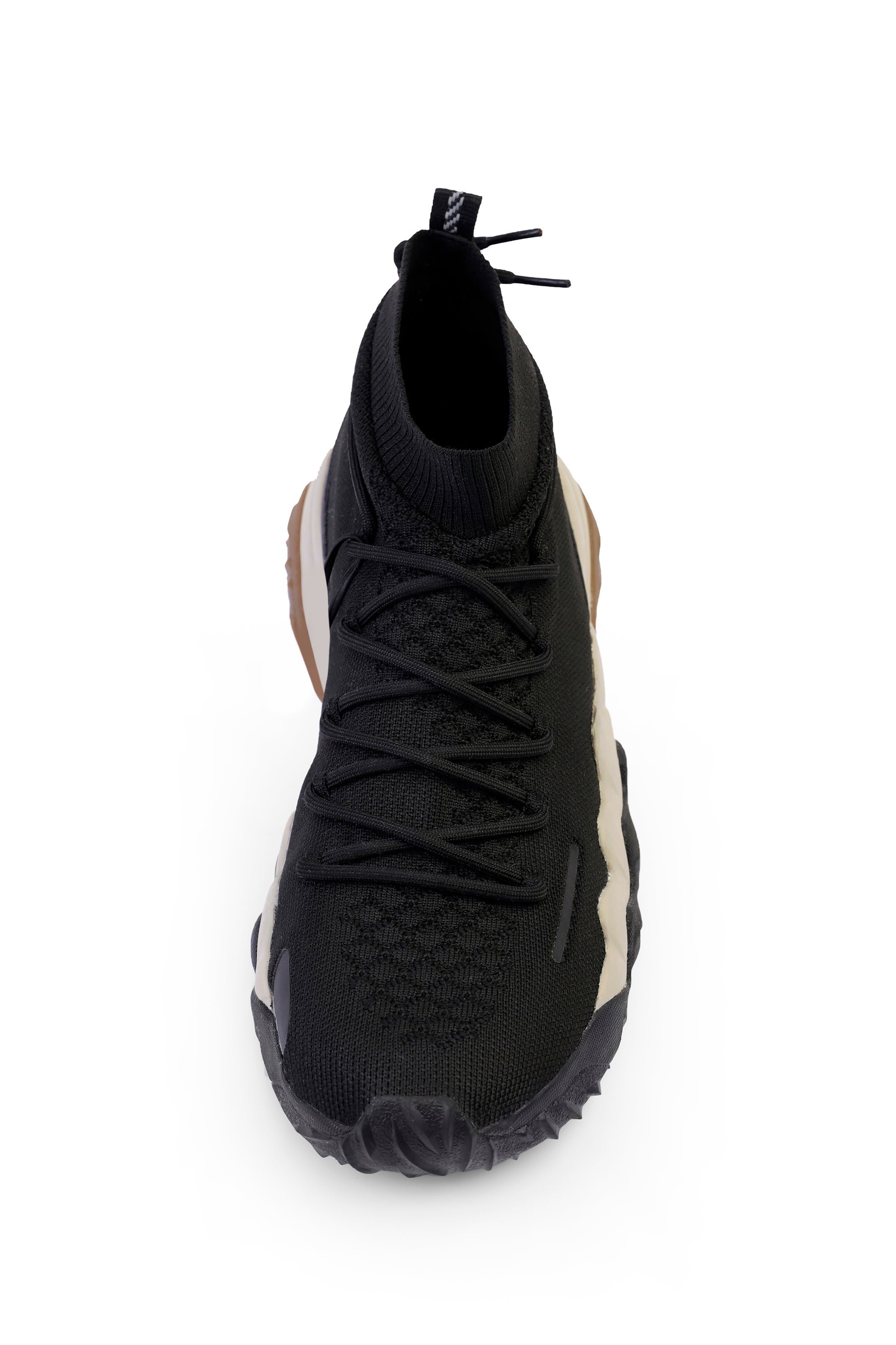Black knit fabric high top trainers. Five eyelet facing. Chunky sole. Multi-piece design.